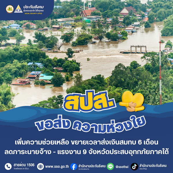 ประกันสังคมเพิ่มความช่วยเหลือ ขยายเวลาส่งเงินสมทบ 6 เดือน ลดภาระนายจ้าง – แรงงาน 9 จังหวัดประสบอุทกภัยภาคใต้
