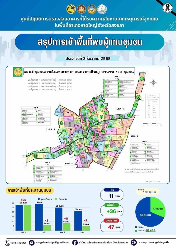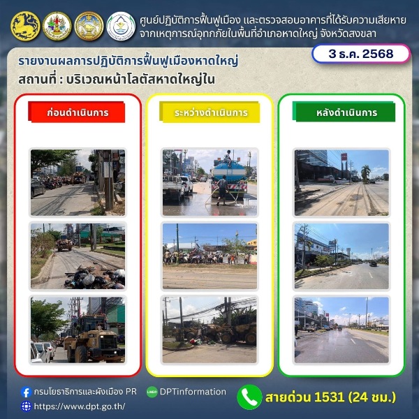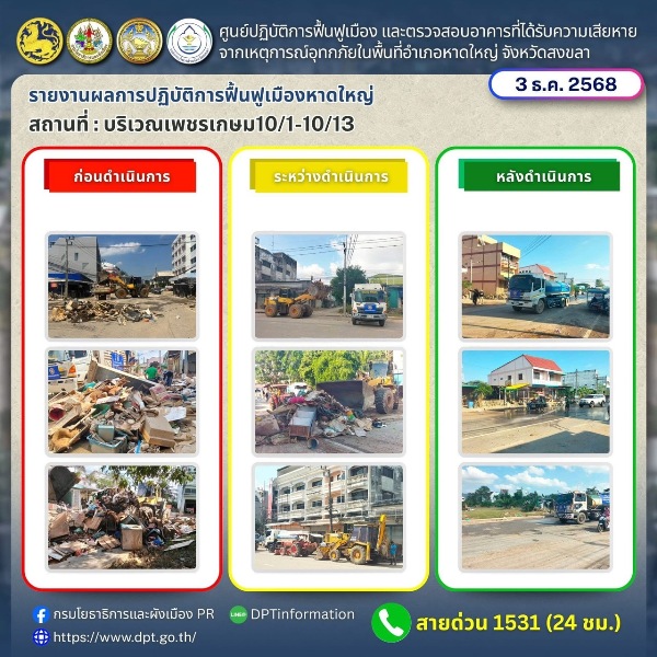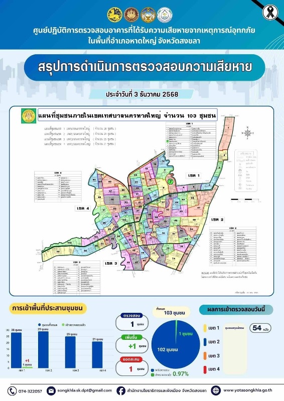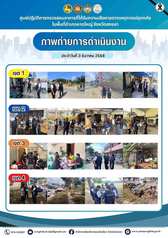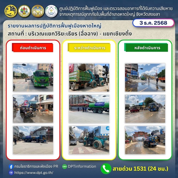 เมื่อวันที่ 3 ธันวาคม 2568 นายพงษ์นรา เย็นยิ่ง อธิบดีกรมโยธาธิการและผังเมือง ได้สั่งการเชิงรุกให้ นายเกิดศักดิ์ ยะโสธร รองอธิบดีกรมโยธาธิการและผังเมือง ในฐานะประธานศูนย์ปฏิบัติการฟื้นฟูเมืองฯ (ส่วนหน้า) ลงพื้นที่วางแผนการทำงานร่วมกับทีมงานและหน่วยงานเครือข่าย ทั้งนี้ในวันเดียวกัน คณะได้ร่วมกับ นายสาคร นิลรัตน์ นายนรินทร์ กวางทอง ผู้ตรวจราชการกรมโยธาธิการและผังเมือง นายไมตรี สรรพสิน โยธาธิการและผังเมืองจังหวัดสงขลา บูรณาการความร่วมมือกับผู้นำชุมชน พร้อมนำทีมนายช่าง วิศวกร ลงพื้นที่สำรวจ ตรวจสอบความเสียหายบ้านเรือน/อาคาร ของพี่น้องประชาชน ซึ่งได้นำร่องในพื้นที่เขตที่ 1 ชุมชนพรุแม่สอน และประชาสัมพันธ์พร้อมทำความเข้าใจแผนการดำเนินการสำรวจความเสียหาย และช่องทางการติดต่อขอรับบริการตรวจสอบบ้านเรือน/อาคาร ร่วมกับผู้นำชุมชน ทั้ง 4 เขต จำนวน 900 หลังคาเรือน เพื่อคืนความปลอดภัยและบรรเทาความเดือดร้อนของประชาชนให้เร็วที่สุด