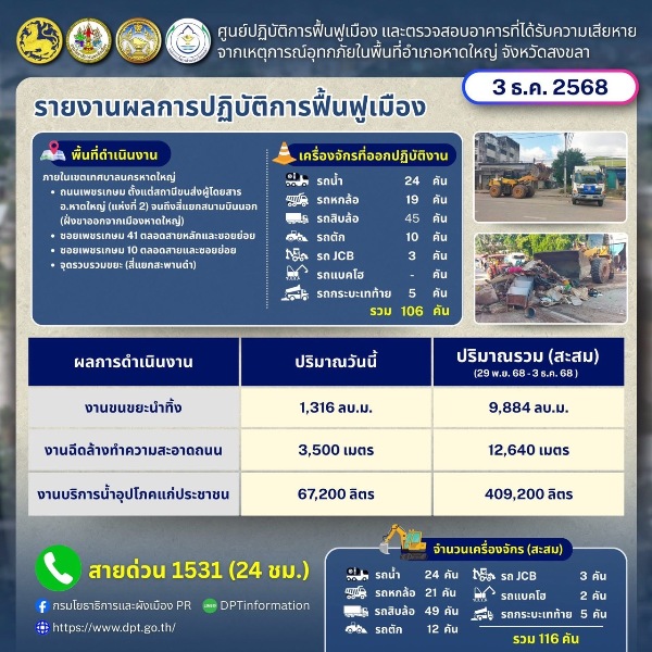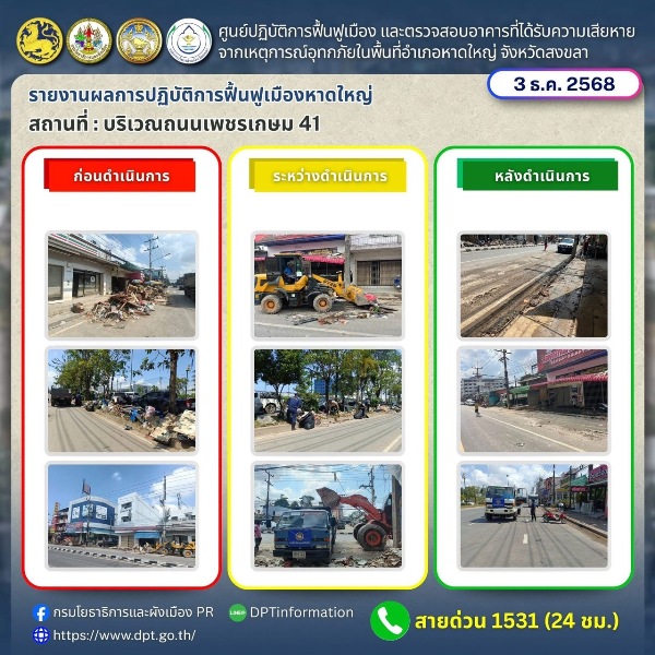 ส่วนภารกิจฟื้นฟู (Big Cleaning) ในเขตเทศบาลนครหาดใหญ่ เขต 3 ประจำวันที่ 3 ธันวาคม 2568 ได้ดำเนินการครอบคลุมพื้นที่สำคัญได้แก่ (1) ถนนเพชรเกษม ตั้งแต่สถานีขนส่งผู้โดยสารอ.หาดใหญ่ (แห่งที่ 2) จนถึงสี่แยกสนามบินนอก (ฝั่งขาออกจากเมืองหาดใหญ่) (2) ซอยเพชรเกษม 41 ตลอดสายหลักและซอยย่อย (3) ซอยเพชรเกษม 10 ตลอดสายและซอยย่อย และ(4) จุดรวบรวมขยะ (สี่แยกสะพานดำ) และมีผลการดำเนินการ ดังนี้