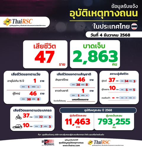 สถานการณ์อุบัติเหตุทางถนนในประเทศไทย วันที่ 4 ธ.ค.68 5 ธันวาคม 2025Thailandplusประชาสัมพันธ์ Facebook iconFacebookTwitter iconTwitterLINE iconLineสถานการณ์อุบัติเหตุทางถนนในประเทศไทย วันที่ 4 ธ.ค.68