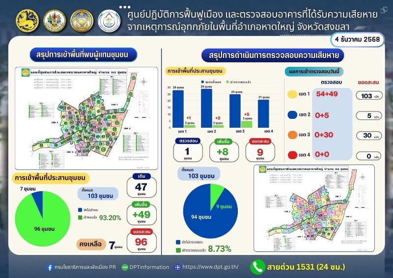 สำหรับการปฏิบัติงานเมื่อวันที่ 4 ธันวาคม 2568 โดยการนำของนายเกิดศักดิ์ ยะโสธร รองอธิบดีกรมโยธาธิการและผังเมือง พร้อมด้วย นายสาคร นิลรัตน์ ผู้ตรวจราชการกรมโยธาธิการและผังเมือง นายไมตรี สรรพสิน โยธาธิการและผังเมืองจังหวัดสงขลา และนายว่าศักดิ์ เจิมจิระ โยธาธิการและผังเมืองจังหวัดนราธิวาส ร่วมกับเจ้าหน้าที่ทุกฝ่าย และคณะนายช่างและวิศวกร 17 จังหวัด ได้ลงพื้นที่พบปะพูดคุย ทำความเข้าใจกับผู้นำชุมชน โดยผลการสำรวจความเสียหายภาพรวมมีความคืบหน้าอย่างก้าวกระโดด คณะสามารถเข้าพบปะพูดคุย ทำความเข้าใจกับผู้นำชุมชน แล้ว 96 ชุมชน คิดเป็นร้อยละ 93.20 ของเป้าหมาย 103 ชุมชน ที่ได้รับผลกระทบ พร้อมกันนี้ ยังได้เข้าพื้นที่ตรวจสอบความเสียหายเชิงลึกเพิ่มเติมอีก 9 ชุมชน 138 หลัง ซึ่งครอบคลุมการประเมินความเสียหายด้าน โครงสร้าง สถาปัตยกรรม ไฟฟ้า เครื่องกล และสุขาภิบาล อย่างละเอียด พร้อมให้คำแนะนำการซ่อมแซมเบื้องต้นแก่ประชาชนทันที เพื่อสร้างความมั่นใจในความปลอดภัย