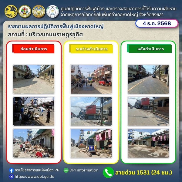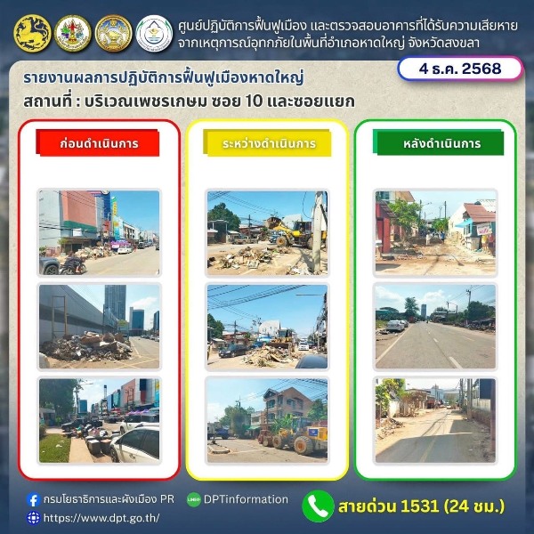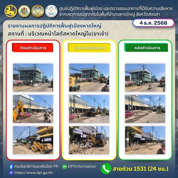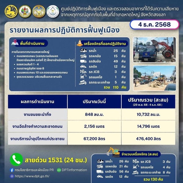 นอกจากนี้ ภารกิจฟื้นฟูเมือง (Big Cleaning) ในเขตเทศบาลนครหาดใหญ่ เขต 3 ซึ่งกรมโยธาธิการและผังเมือง ร่วมกับหน่วยงานพันธมิตร ได้ขับเคลื่อนอย่างต่อเนื่อง มุ่งเน้นการคืนพื้นที่สะอาดและปลอดภัย โดยมีผลการดำเนินการสะสมตั้งแต่วันที่ 29 พฤศจิกายน – 4 ธันวาคม 2568 ดังนี้