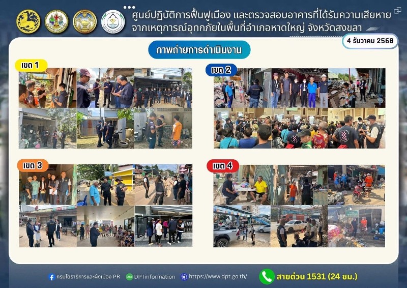 กรมโยธาธิการและผังเมือง (ยผ.) โดยศูนย์ปฏิบัติการฟื้นฟูเมืองฯ (ส่วนหน้า) เร่งรัดภารกิจสำรวจและตรวจสอบความเสียหายของบ้านเรือน/อาคารในพื้นที่อำเภอหาดใหญ่ จังหวัดสงขลา เพื่อให้ได้ฐานข้อมูลที่สมบูรณ์ตามหลักวิศวกรรม มุ่งสู่การเยียวยาประชาชนอย่างรวดเร็ว