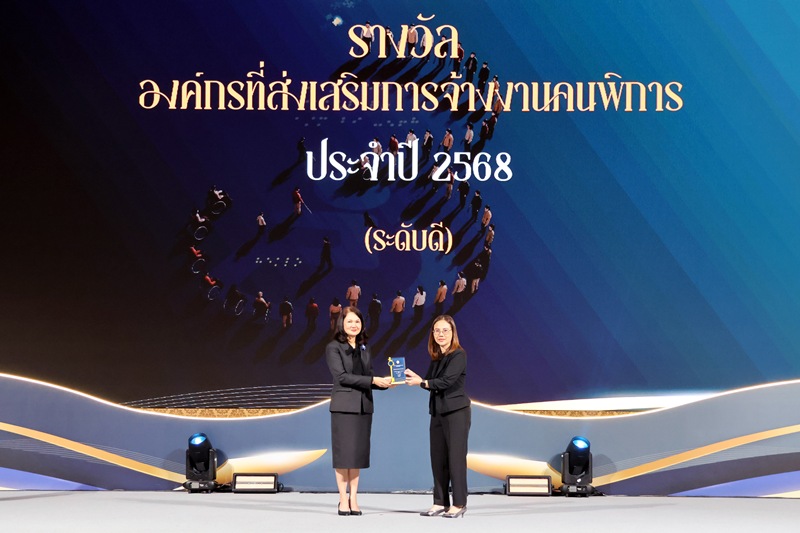 ในการนี้ นางสาวรำไพ ชมภู่ (ขวา) ผู้อำนวยการฝ่ายทรัพยากรมนุษย์และระบบบริหารงานคุณภาพ เป็นผู้แทนบริษัทฯ เข้ารับมอบรางวัลจาก นางสาวสนธยา บุณยภูษิต (ซ้าย) อธิบดีกรมส่งเสริมและพัฒนาคุณภาพชีวิตคนพิการ