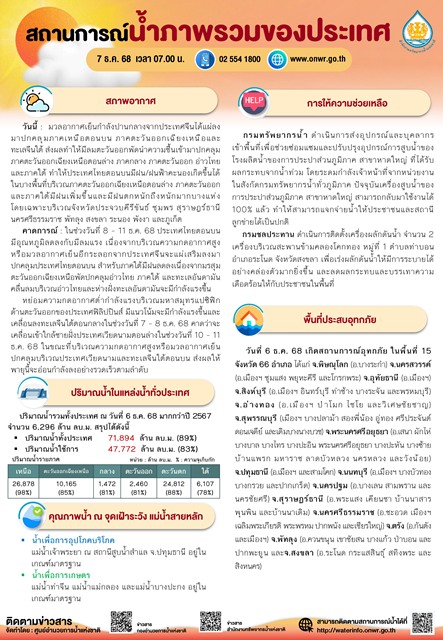 5. พื้นที่ประสบอุทกภัย : วันที่ 6 ธ.ค. 68 เกิดสถานการณ์อุทกภัย ในพื้นที่ 15 จังหวัด 66 อำเภอ ได้แก่ จ.พิษณุโลก (อ.บางระกำ) จ.นครสวรรค์ (อ.เมืองฯ ชุมแสง พยุหะคีรี และโกรกพระ) จ.อุทัยธานี (อ.เมืองฯ) จ.สิงห์บุรี (อ.เมืองฯ อินทร์บุรี ท่าช้าง บางระจัน และพรหมบุรี) จ.อ่างทอง (อ.เมืองฯ ป่าโมก ไชโย และวิเศษชัยชาญ) จ.สุพรรณบุรี (เมืองฯ บางปลาม้า สองพี่น้อง อู่ทอง ศรีประจันต์ ดอนเจดีย์ และเดิมบางนางบวช) จ.พระนครศรีอยุธยา (อ.เสนา ผักไห่ บางบาล บางไทร บางปะอิน พระนครศรีอยุธยา บางปะหัน บางซ้าย บ้านแพรก มหาราช ลาดบัวหลวง นครหลวง และวังน้อย) จ.ปทุมธานี (อ.เมืองฯ และสามโคก) จ.นนทบุรี (อ.เมืองฯ บางบัวทอง บางกรวย และปากเกร็ด) จ.นครปฐม (อ.บางเลน สามพราน และนครชัยศรี).จ.สุราษฏร์ธานี (อ.พระแสง เคียนชา บ้านนาสาร พุนพิน และบ้านนาเดิม) จ.นครศรีธรรมราช (อ.ชะอวด เมืองฯ เฉลิมพระเกียรติ พระพรหม ปากพนัง และเชียรใหญ่) จ.ตรัง (อ.กันตัง และเมืองฯ) จ.พัทลุง (อ.ควนขนุน เขาชัยสน บางแก้ว ป่าบอน และปากพะยูน และ จ.สงขลา (อ.ระโนด กระแสสินธุ์ สทิงพระ และ สิงหนคร)