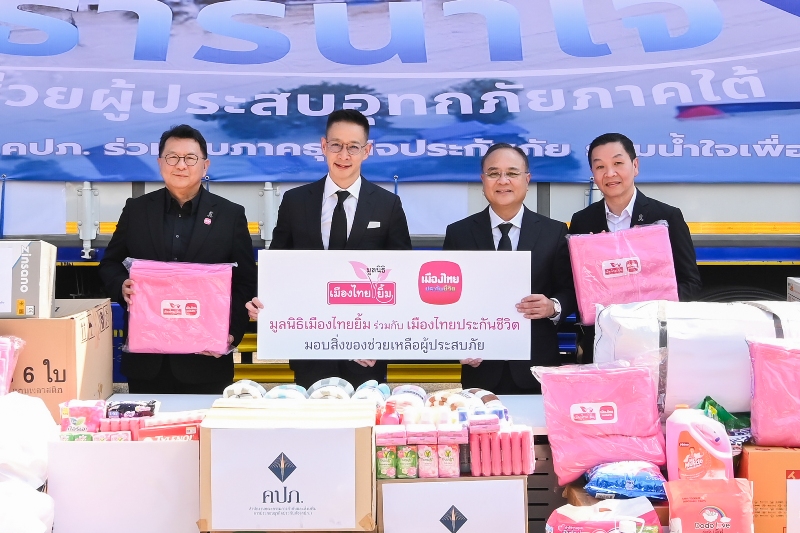 บริษัท เมืองไทยประกันชีวิต จำกัด (มหาชน) และมูลนิธิเมืองไทยยิ้ม ร่วมสนับสนุนการช่วยเหลือผู้ประสบอุทกภัยในพื้นที่ภาคใต้ ผ่านโครงการ “ธารน้ำใจช่วยผู้ประสบภัยภาคใต้” ของสำนักงานคณะกรรมการกำกับและส่งเสริมการประกอบธุรกิจประกันภัย (คปภ.) โดยได้ส่งมอบผ้าห่มเพื่อช่วยบรรเทาความเดือดร้อนและสร้างขวัญกำลังใจให้แก่ประชาชนที่ได้รับผลกระทบจากสถานการณ์น้ำท่วมในหลายจังหวัดภาคใต้