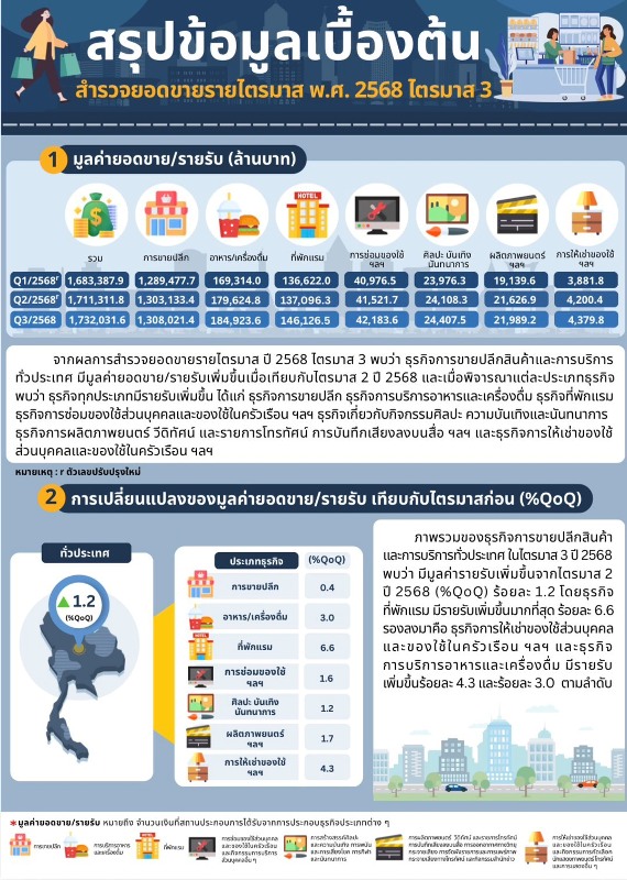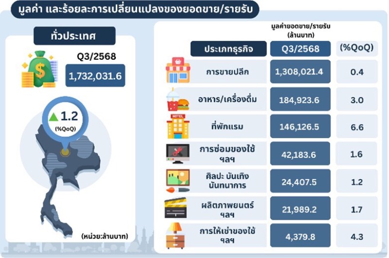 ภาพรวมของธุรกิจการขายปลีกสินค้าและการบริการทั่วประเทศ ในไตรมาส 3 ปี 2568 พบว่า มีมูลค่ารายรับเพิ่มขึ้นจากไตรมาส 2 ปี 2568 (%QoQ) ร้อยละ 1.2 โดยธุรกิจที่พักแรม มีรายรับเพิ่มขึ้นมากที่สุดร้อยละ 6.6 รองลงมาคือ ธุรกิจการให้เช่าของใช้ส่วนบุคคลและของใช้ในครัวเรือน ฯลฯ และธุรกิจการบริการอาหารและเครื่องดื่ม มีรายรับเพิ่มขึ้นร้อยละ 4.3 และร้อยละ 3.0 ตามลำดับ