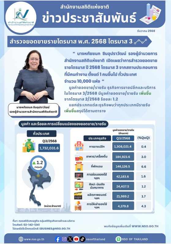 นางหทัยชนก ชินอุปราวัฒน์ รองผู้อำนวยการสำนักงานสถิติแห่งชาติ เปิดเผยว่า สำนักงานสถิติแห่งชาติ ได้ทำการสำรวจยอดขายรายไตรมาส จากสถานประกอบการที่มีคนทำงานตั้งแต่ 1 คนขึ้นไป ทั่วประเทศ ที่ประกอบธุรกิจการขายปลีก ที่พักแรม การบริการอาหารและเครื่องดื่ม การผลิตภาพยนตร์ วีดิทัศน์ และรายการโทรทัศน์ การบันทึกเสียงลงบนสื่อ ฯลฯ การให้เช่าของใช้ส่วนบุคคลและของใช้ในครัวเรือน และกิจกรรมการคัดเลือกนักแสดงภาพยนตร์ โทรทัศน์ และการแสดงอื่น ๆ กิจกรรมการสร้างสรรค์ศิลปะ ความบันเทิง การพนัน การเสี่ยงโชค การกีฬา และนันทนาการ และการซ่อมของใช้ส่วนบุคคลและของใช้ในครัวเรือน และกิจกรรมการบริการส่วนบุคคลอื่น ๆ จำนวน 10,000 แห่ง เป็นประจำทุกไตรมาส สรุปได้ดังนี้