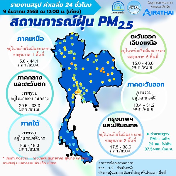 ศูนย์สื่อสารการแก้ไขปัญหามลพิษทางอากาศ (ศกพ.) กรมควบคุมมลพิษ รายงานคุณภาพอากาศประจำวันที่ 9 ธันวาคม 2568 ณ 12:00 น ภาพรวมปริมาณฝุ่นละออง PM2.5 ในประเทศ เริ่มขยับสูงขึ้นในบางพื้นที่ โดยพบเกินค่ามาตรฐานใน (สีส้ม) บางจังหวัดในพื้นที่ภาคตะวันออกเฉียงเหนือ ได้แก่ นครพนม กาฬสินธุ์ มหาสารคาม ร้อยเอ็ด และยโสธร พื้นที่ภาคเหนือตอนล่าง พบเกินค่ามาตรฐานที่จังหวัดสุโขทัย ในขณะที่พื้นที่กรุงเทพมหานครและปริมณฑล พบเกินค่ามาตรฐาน 2 แห่ง โดยภาคเหนือ ตรวจวัดได้ 5.0 – 44.1 ไมโครกรัมต่อลูกบาศก์เมตร (มคก./ลบ.ม.) ภาคตะวันออกเฉียงเหนือ 15.0 – 43.0 มคก./ลบ.ม. ภาคกลางและภาคตะวันตก 20.6 – 33.0 มคก./ลบ.ม. ภาคตะวันออก 13.4 – 31.2 มคก./ลบ.ม. ภาคใต้ 8.9 – 18.0 มคก./ลบ.ม. กรุงเทพมหานครและปริมณฑล 17.5 – 38.6 มคก./ลบ.ม.