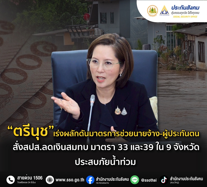 นางสาวตรีนุช เทียนทอง รัฐมนตรีว่าการกระทรวงแรงงาน เปิดเผยว่าได้เร่งให้ สปส.เพิ่มมาตรการช่วยเหลือนายจ้าง ผู้ประกันตน ใน 9 พื้นที่ประสบอุทกภัยภาคใต้ ซึ่งนอกจากมาตรการขยายระยะเวลาการนำส่งเงินสมทบเป็นระยะเวลา 6 เดือน ตามที่ ครม. ได้มีมติเห็นชอบเรียบร้อยแล้ว เมื่อวันที่ 9 ธันวาคม 2568 ได้ให้ สปส. เร่งหามาตรการเพิ่มเติม โดย สปส. ได้เสนอมาตรการลดอัตราเงินสมทบ มาตรา 33 และมาตรา 39 ในพื้นที่ประสบอุทกภัย 9 จังหวัดภาคใต้ เป็นระยะเวลา 6 เดือน เริ่มตั้งแต่เงินสมทบงวดเดือน ธ.ค. 68 – พ.ค.69