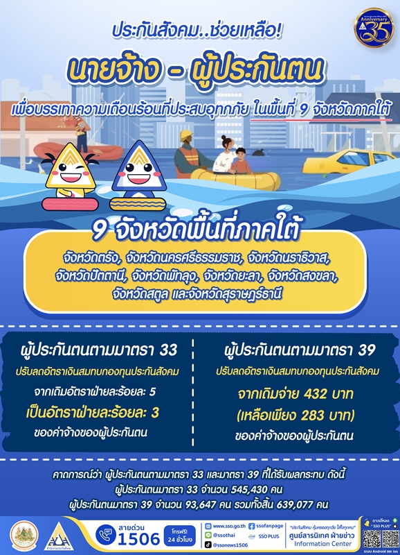 นางสาวกาญจนา พูลแก้ว เลขาธิการสำนักงานประกันสังคม กล่าวว่า สำนักงานประกันสังคมเร่งดำเนินการเพื่อให้การช่วยเหลือ นายจ้าง ผู้ประกันตนมาตรา 33 และมาตรา 39 ที่ได้รับความเดือดร้อนจากอุทกภัย ตามประกาศเขตให้การช่วยเหลือผู้ประสบภัยพิบัติกรณีฉุกเฉินของกรมป้องกันและบรรเทาสาธารณภัยกระทรวงมหาดไทย ในพื้นที่ประสบอุทกภัย 9 จังหวัดภาคใต้ ได้แก่ จังหวัดตรัง นครศรีธรรมราช นราธิวาส ปัตตานี พัทลุง ยะลา สงขลา สตูล และสุราษฎร์ธานี เพื่อบรรเทาภาระของสถานประกอบการและแรงงานที่ได้รับผลกระทบ จากสถานการณ์น้ำท่วมอย่างรุนแรง โดย ครม.ได้ให้ความเห็นชอบมาตรการขยายระยะเวลาการนำส่งเงินสมทบไปแล้ว และได้พิจารณามาตรการเพิ่มเติมตามที่รัฐมนตรีว่าการกระทรวงแรงงานมอบหมาย โดยได้เสนอเพิ่มมาตรการลดอัตราเงินสมทบเพื่อช่วยให้สถานประกอบการสามารถคงการจ้างงานต่อไปได้ในสถานการณ์วิกฤต พร้อมทั้งลดภาระค่าใช้จ่ายของผู้ประกันตนที่ได้รับผลกระทบจากอุทกภัย ส่งผลให้ยังคงอยู่ในระบบประกันสังคมอย่างต่อเนื่อง และไม่เสียสิทธิประโยชน์ที่พึงได้รับ ซึ่งมาตรการลดอัตราเงินสมทบในพื้นที่ 9 จังหวัดภาคใต้ที่ประสบอุทกภัย เป็นระยะเวลา 6 เดือน จะเริ่มตั้งแต่การนำส่งเงินสมทบงวดเดือนธันวาคม 2568 ถึงงวดเดือนพฤษภาคม 2569 ดังนี้