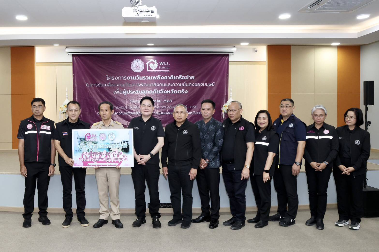 วันที่ 10 ธันวาคม 2568 นายอัครา พรหมเผ่า รัฐมนตรีว่าการกระทรวงการพัฒนาสังคมและความมั่นคงของมนุษย์ (รมว.พม.) ลงพื้นที่จังหวัดตรัง เพื่อเป็นประธานเปิดโครงการงานวันรวมพลังภาคีเครือข่ายในการขับเคลื่อนงานด้านการพัฒนาสังคมและความมั่นคงของมนุษย์เพื่อผู้ประสบอุทกภัยจังหวัดตรัง พร้อมมอบนโยบาย “พม.ใกล้คุณ” ลดรายจ่าย สร้างรายได้ รีสตาร์ทชีวิต เพื่อยกระดับพัฒนาคุณภาพชีวิตประชาชนทุกกลุ่มเป้าหมาย โดยเฉพาะกลุ่มเปราะบาง อีกทั้งปล่อยขบวนคาราวานรถสิ่งของบริจาคเครื่องอุปโภคบริโภคที่จำเป็น เพื่อนำไปส่งต่อความช่วยเหลือให้กับกลุ่มเปราะบางและประชาชนที่ได้รับผลกระทบจากอุทกภัย โดยมีนายกันตพงศ์ รังษีสว่าง ปลัดกระทรวงการพัฒนาสังคมและความมั่นคงของมนุษย์ (ปลัด พม.) พร้อมด้วยคณะผู้บริหารกระทรวง พม. และทีมพม.ใกล้คุณจังหวัดตรัง , นายทรงกลด สว่างวงศ์ ผู้ว่าราชการจังหวัดตรัง , ผู้บริหารและผู้นำท้องถิ่น และผู้แทนเครือข่ายในพื้นที่ เข้าร่วม ณ หอประชุมแก้มลิงเมืองตรัง วิทยาลัยสารพัดช่างตรัง อำเภอเมือง จังหวัดตรัง