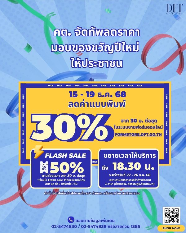 กิจกรรมลดค่าฟอร์มหนังสือรับรองถิ่นกำเนิดสินค้า (C/O) แบบกระดาษ A4 เฉพาะที่จำหน่ายผ่านระบบจำหน่ายออนไลน์ของกรมฯ (https://formstore.dft.go.th) จะจัดขึ้นระหว่างวันที่ 15 – 19 ธันวาคม 2568 เป็นเวลา 5 วันเต็ม โดยลดราคาแบบฟอร์มทุกชนิด 30% จากชุดละ 30 บาท เหลือ 21 บาท พร้อมลุ้นเซอร์ไพรส์ Flash Sale ลดสูงสุด 50% เหลือชุดละ 15 บาท จำกัดจำนวน 100 ชุดต่อบริษัทต่อวัน ถือเป็นของขวัญพิเศษเพื่อส่งเสริมและสร้างความพร้อมให้ภาคเอกชนใช้งานระบบ SMART C/O โดยเลือกพิมพ์หนังสือรับรองฯ ด้วยตนเอง (Self – Printing) ซึ่งช่วยลดภาระค่าใช้จ่ายให้ผู้ประกอบการ ไม่ต้องเดินทางมารับหนังสือรับรองฯ ด้วยตนเอง ประหยัดทั้งต้นทุนและเวลาได้อย่างแท้จริง