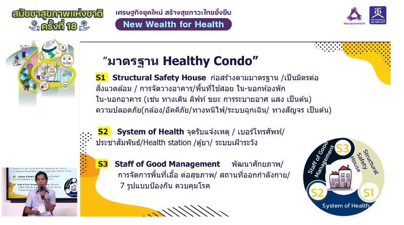 นางตรีอมร กล่าวว่า การป้องกันควบคุมโรคในอาคารสูงให้มีประสิทธิภาพ ได้ถอดออกมาเป็น “มาตรฐาน Healthy Condo” โดยมีกรอบแนวคิดของ 3S ซึ่งประกอบด้วย 1. Structural Safety House การมีโครงสร้างที่ปลอดภัย ก่อสร้างตามมาตรฐาน มีการจัดวางอาคารที่ดี ทางเดิน ทางหนีไฟ ป้ายสัญญาณต่างๆ ที่มีความชัดเจน รวมไปถึงถนนหนทางโดยรอบที่รถฉุกเฉินสามารถเข้าถึงได้ เป็นต้น ซึ่งการจัดโครงสร้างที่ดีเป็นสิ่งสำคัญที่ชุมชนอาคารสูงควรมี และจะช่วยชีวิตคนได้