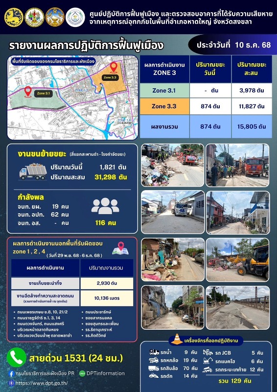 ทั้งนี้ ภารกิจที่ดำเนินการควบคู่ไปพร้อมกันอย่างต่อเนื่องคือ การดำเนินการฟื้นฟู Big Cleanning อำเภอหาดใหญ่ จังหวัดสงขลาโซน 3 จากการปฏิบัติงานตั้งแต่วันแรกจนถึงปัจจุบันมีความคืบหน้า กว่า 80% การดำเนินงานได้รวมพลังเจ้าหน้าที่ของกรมฯ และเจ้าหน้าที่ อปท. กว่า 116 คน โดยนำเครื่องจักร 129 คัน เร่งจัดเก็บขยะออกจากพื้นที่ชุมชนโดยเร็วที่สุด ซึ่งมีปริมาณจำนวน 15,805 ตัน กรมฯ ยังมีหน้าที่รับผิดชอบในการขนย้ายขยะ ณ จุดพักขยะชั่วคราวบริเวณสี่แยกสะพานดำ ลำเลียงไปที่บ่อขยะตำบลเกาะแต้ว อำเภอเมือง จังหวัดสงขลา ปริมาณสะสม 31,298 ตัน รวมถึงการบริการน้ำอุปโภคแก่ประชาชน สะสมจำนวน 508,400 ลิตร เพื่ออำนวยความสะดวกให้พี่น้องประชาชนมีน้ำไว้ใช้ทำความสะอาดบ้าน/อาคาร หรือใช้ประโยชน์อื่นๆ