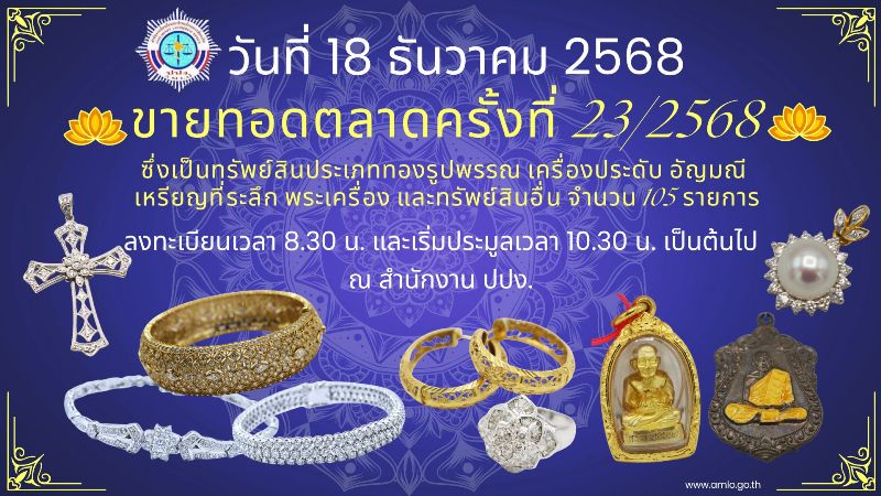 สำนักงาน ปปง. จะทำการขายทอดตลาดทรัพย์สินโดยวิธีการประมูลปากเปล่า ครั้งที่ 23/2568 ซึ่งเป็นทรัพย์สินประเประเภททองรูปพรรณ เครื่องประดับอัญมณี เหรียญที่ระลึก พระเครื่อง และทรัพย์สินอื่น จำนวน 105 รายการ โดยจะทำการขายทอดตลาดทรัพย์สินในวันที่ 18 ธันวาคม 2568 ลงทะเบียนตั้งแต่เวลา 08.30 น. เริ่มประมูลเวลา 10.00 น. เป็นต้นไป ณ บริเวณชั้น 1 อาคารสำนักงาน ปปง. โดยมีรายการทรัพย์สินที่น่าสนใจ ดังนี้