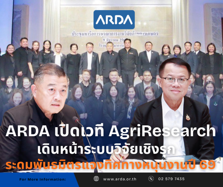 สำนักงานพัฒนาการวิจัยการเกษตร (องค์การมหาชน) หรือ ARDA จัดประชุม “AgriResearch One : รวมพลังวิจัยเพื่ออนาคตเกษตรไทย” เพื่อประกาศทิศทางการวิจัยเชิงรุกครั้งสำคัญ ตอบโจทย์นโยบาย Ignite Thailand – Agriculture Hub ที่มุ่งพลิกโครงสร้างภาคเกษตรไทยจากระบบผลิตดั้งเดิม สู่เศรษฐกิจฐานนวัตกรรมและมูลค่าสูง ทั้งนี้ ได้รับเกียรติจากนายวิณะโรจน์ ทรัพย์ส่งสุข ปลัดกระทรวงเกษตรและสหกรณ์ เป็นประธานฯ โดยมี ดร.ทวีศักดิ์ ธนเดโชพล ผู้อำนวยการ ARDA พร้อมผู้บริหารหน่วยงานในสังกัดกระทรวงเกษตรฯ ร่วมประชุม ณ โรงแรมรามาการ์เด้นส์ กรุงเทพฯ