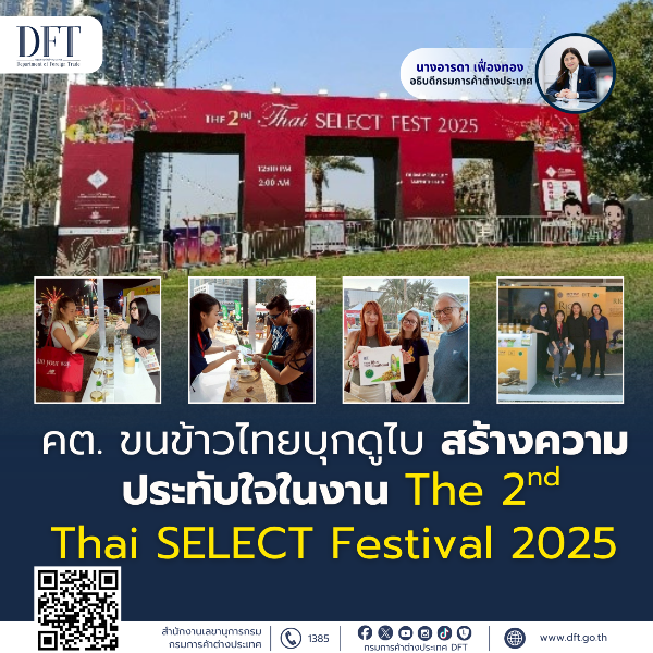 นางอารดา เฟื่องทอง อธิบดีกรมการค้าต่างประเทศ เปิดเผยว่า จากนโยบายของนางศุภจี สุธรรมพันธุ์ รัฐมนตรีว่าการกระทรวงพาณิชย์ การขยายตลาดใหม่ โดยเน้นตลาดที่มีความต้องการและมีศักยภาพสูงอย่างภูมิภาคตะวันออกกลาง โดยเฉพาะสหรัฐอาหรับเอมิเรตส์ กรมฯ จึงได้จัดคณะผู้แทนฯ เดินทางไปจัดกิจกรรมส่งเสริมและประชาสัมพันธ์ภาพลักษณ์ข้าวไทยในงาน The 2nd Thai SELECT Festival 2025 ระหว่างวันที่ 28 – 30 พฤศจิกายน 2568 ณ Dubai Media City Amphitheatre ณ เมืองดูไบ สหรัฐอาหรับเอมิเรตส์ ซึ่งจัดโดยกรมส่งเสริมการค้าระหว่างประเทศ วัตถุประสงค์ของการจัดงานเพื่อส่งเสริมภาพลักษณ์สินค้าและบริการที่มีศักยภาพของไทย โดยเฉพาะสินค้าและบริการในกลุ่ม Soft Power ได้แก่ อาหาร เครื่องดื่ม แฟชั่น ไลฟ์สไตล์ และร้านอาหาร Thai SELECT หรือแนวคิด 5F ได้แก่ Food (อาหารและเครื่องดื่ม) Fight (ศิลปะมวยไทย) Festival (ศิลปวัฒนธรรมไทย) Film (ภาพยนตร์ไทยที่เน้นวัฒนธรรมไทยและวัตถุดิบอาหารไทย) และ Fashion (แฟชั่นโชว์ชุดผ้าไทย)