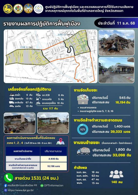 🔻 ภารกิจฟื้นฟูเมือง (Big Cleaning) กรมฯ ปฏิบัติงานในพื้นที่โซน 3 เก็บขยะ&ฉีดล้างทำความสะอาด มีปริมาณขยะสะสมรวมกว่า 17,078 ตัน ดำเนินการทำความสะอาดถนนสะสม 42,830 เมตร