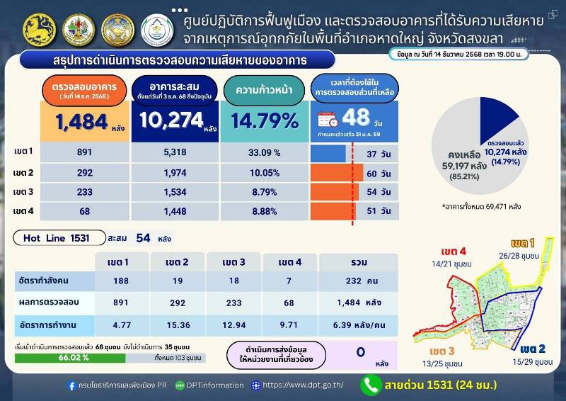 🔻 ภารกิจตรวจสอบความเสียหายอาคารบ้านเรือน มีเป้าหมายเข้าสำรวจตรวจสอบความมั่นคงแข็งแรงและประเมินความเสียหายของบ้านเรือนประชาชน ในพื้นที่ 4 เขต 103 ชุมชน จำนวนอาคาร ทั้งหมด 69,471 หลัง โดยความคืบหน้าในปัจจุบันดำเนินการแล้วเสร็จ 10,274 หลัง คิดเป็นความก้าวหน้า 14.79%