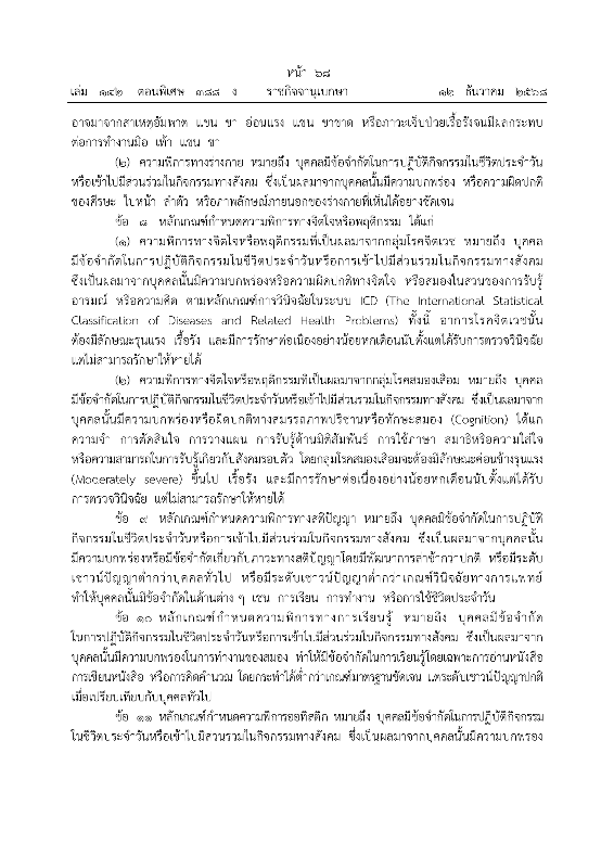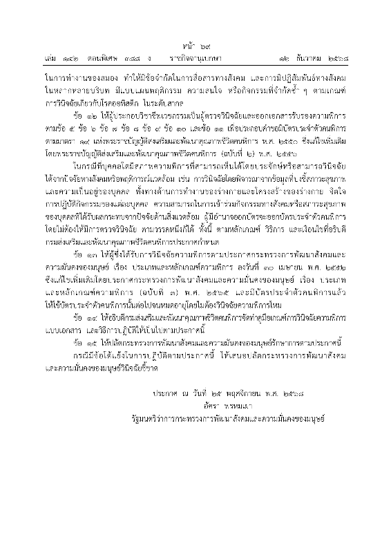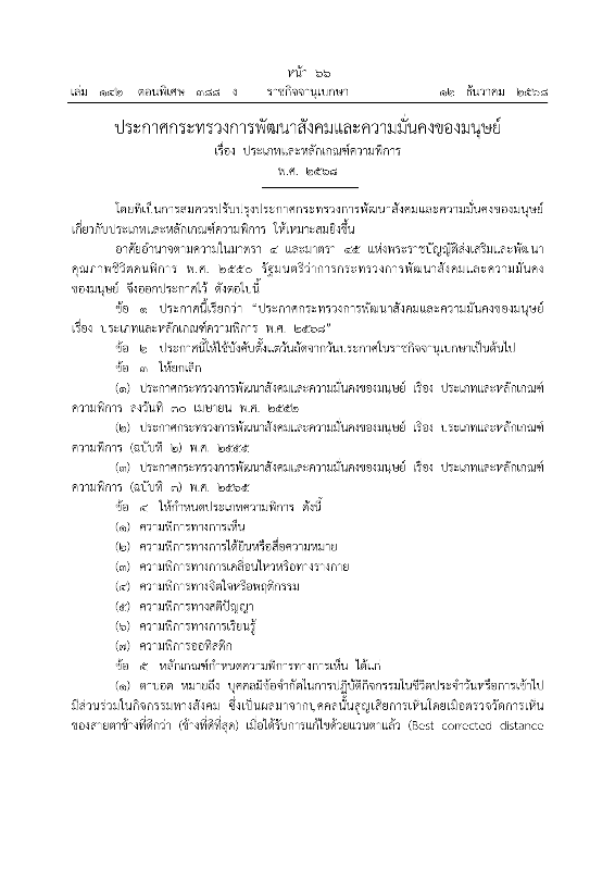 นายอัครา กล่าวว่า ล่าสุดได้มีประกาศกระทรวงการพัฒนาสังคมและความมั่นคงของมนุษย์ เรื่อง ประเภทและหลักเกณฑ์ความพิการ พ.ศ. 2568 ซึ่งได้ประกาศในราชกิจจานุเบกษา เมื่อวันที่ 12 ธันวาคม 2568 และมีผลบังคับใช้เมื่อวันที่ 13 ธันวาคม 2568 เป็นต้นไป โดยมีการปรับปรุงเกี่ยวกับประเภทและหลักเกณฑ์ความพิการให้มีความเหมาะสมยิ่งขึ้น อาทิ คนที่ตาบอดข้างเดียว นิ้วมือขาด นิ้วเท้าขาด หรือมีลักษณะอวัยวะร่างกายส่วนใดส่วนหนึ่งที่ไม่ครบ 32 ประการ เพื่อทำให้คนพิการดังกล่าวสามารถทำบัตรประจำตัวคนพิการได้ และรับสิทธิสวัสดิการจากภาครัฐเพิ่มมากขึ้น เป็นการสร้างความเท่าเทียมและยกระดับคุณภาพชีวิตที่ดีให้กับคนพิการทุกกลุ่มอย่างยั่งยืน