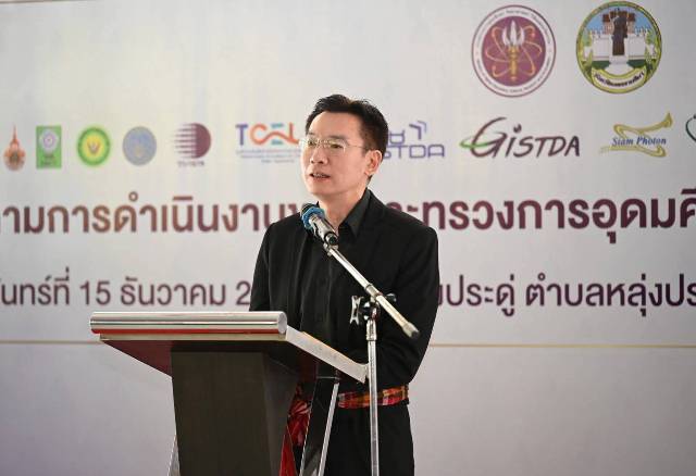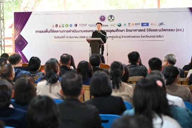 วันที่ 15 ธันวาคม 2568 ศ.ดร.ศุภชัย ปทุมนากุล ปลัดกระทรวงการอุดมศึกษา วิทยาศาสตร์ วิจัยและนวัตกรรม ลงพื้นที่จังหวัดนครราชสีมา เพื่อติดตามการขับเคลื่อนงานด้านการอุดมศึกษา วิทยาศาสตร์ วิจัยและนวัตกรรม ในการยกระดับคุณภาพชีวิตประชาชนและเสริมสร้างความเข้มแข็งให้กับเศรษฐกิจฐานราก โดย ผู้บริหารหน่วยงานในสังกัดกระทรวง อว. ผู้บริหารจังหวัด และหน่วยงานที่เกี่ยวข้องเข้าร่วม ติดตามการขับเคลื่อน อววน. โดย วช.ประกอบด้วย ดร.วิภารัตน์ ดีอ่อง ผู้อำนวยการสำนักงานการวิจัยแห่งชาติ นางสาวเสาวนีย์ มุ่งสุจริตการ รองผู้อำนวยการสำนักงานการวิจัยแห่งชาติ พร้อมด้วยคณะผู้บริหาร วช. ร่วมติดตามการขับเคลื่อน อววน. ในพื้นที่ ณ วัดบ้านหลุ่งประดู่ อำเภอห้วยแถลง จังหวัดนครราชสีมา