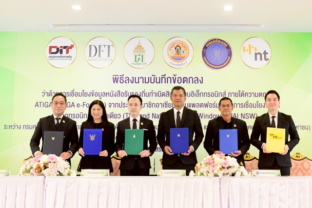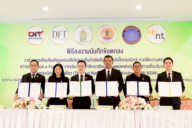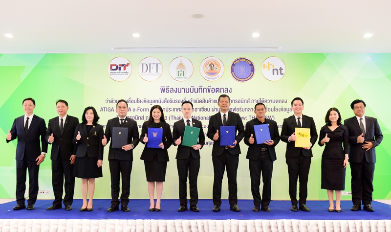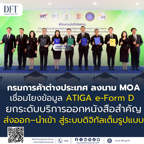 กรมการค้าต่างประเทศ กระทรวงพาณิชย์ ร่วมกับกรมศุลกากร และบริษัท โทรคมนาคมแห่งชาติ จำกัด (มหาชน) ลงนามบันทึกข้อตกลงความร่วมมือ (MOA) ว่าด้วยการเชื่อมโยงข้อมูลหนังสือรับรองถิ่นกำเนิดสินค้าแบบอิเล็กทรอนิกส์ ภายใต้ความตกลงการค้าสินค้าอาเซียน (ATIGA e-Form D) ผ่านแพลตฟอร์มกลางการเชื่อมโยงข้อมูลอิเล็กทรอนิกส์ ณ จุดเดียว หรือ Thailand National Single Window (THAI NSW) เพื่อยกระดับกระบวนการอำนวยความสะดวกทางการค้าให้มีประสิทธิภาพ โปร่งใส และสอดคล้องกับมาตรฐานสากล