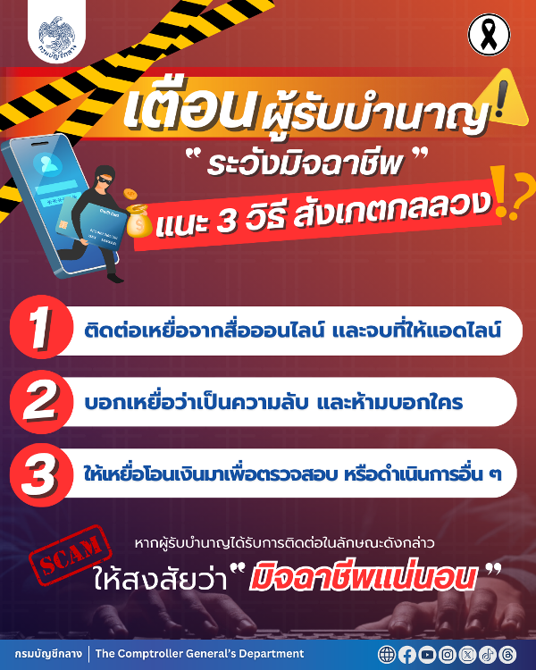 กรมบัญชีกลางเตือนผู้รับบำนาญระวังมิจฉาชีพ!! แนะ 3 วิธีสังเกตกลลวงมิจฉาชีพ