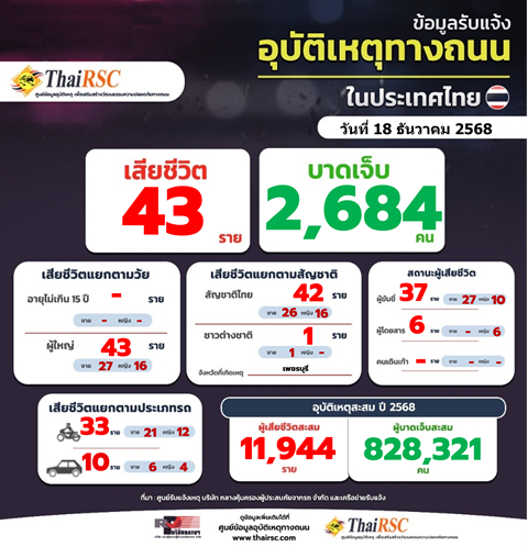 สถานการณ์อุบัติเหตุทางถนนในประเทศไทย วันที่ 18 ธ.ค.68 19 ธันวาคม 2025Thailandplusประชาสัมพันธ์ Facebook iconFacebookTwitter iconTwitterLINE iconLineสถานการณ์อุบัติเหตุทางถนนในประเทศไทย วันที่ 18 ธ.ค.68