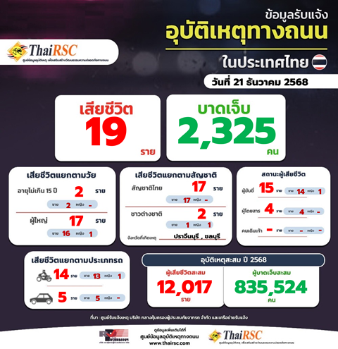 สถานการณ์อุบัติเหตุทางถนนในประเทศไทย วันที่ 21 ธ.ค.68