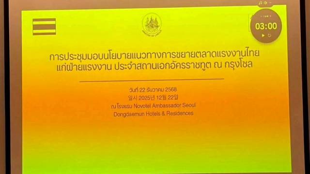 วันที่ 22 ธันวาคม 2568 เวลา 09.00 น. ตามเวลาท้องถิ่นสาธารณรัฐเกาหลี นางสาวตรีนุช เทียนทอง รัฐมนตรีว่าการกระทรวงแรงงาน ประชุมมอบนโยบายและหารือการขยายตลาดแรงงานไทยในต่างประเทศกับฝ่ายแรงงาน ประจำสถานเอกอัครราชทูต ณ กรุงโซล โดยมี พันตำรวจโท วรรณพงษ์ คชรักษ์ ปลัดกระทรวงแรงงาน นายสมชาย มรกตศรีวรรณ อธิบดีกรมการจัดหางาน นายสมาสภ์ ปัทมะสุคนธ์ อธิบดีกรมพัฒนาฝีมือแรงงาน นายศักดินาถ สนธิศักดิ์โยธิน ผู้ช่วยปลัดกระทรวงแรงงาน นายสมชาติ สุภารี รองอธิบดีกรมพัฒนาฝีมือแรงงาน นางศิริรัตน์ ศรีชาติ อัครราชทูตที่ปรึกษา (ฝ่ายแรงงาน) และคณะ ร่วมด้วย ณ ห้องประชุมโรงแรม Novotel Ambassador Seoul