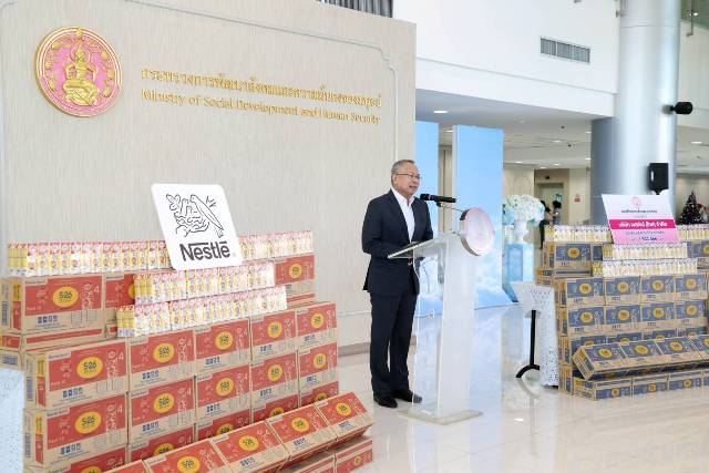 วันที่ 23 ธันวาคม 2568 นายกันตพงศ์ รังษีสว่าง ปลัดกระทรวงการพัฒนาสังคมและความมั่นคงของมนุษย์ (ปลัด พม.) เป็นประธานในพิธีรับมอบผลิตภัณฑ์นม ได้แก่ 1) นม UHT จำนวน 941 ลัง 2) นมผง จำนวน 300 ลัง และ 3) ซีรีแล็ค อาหารเสริมสำหรับเด็ก จำนวน 100 ลัง รวมมูลค่าทั้งสิ้น 1,603,068 บาท จากบริษัท เนสท์เล่ (ไทย) จำกัด โดยคุณพัสสมน อภิปวินท์วงศา ผู้จัดการกลุ่มสินค้าโภชนาการเด็ก และคณะ เพื่อให้กระทรวงการพัฒนาสังคมและความมั่นคงของมนุษย์ (พม.) ส่งต่อไปช่วยเหลือเด็กที่ได้รับผลกระทบในพื้นที่ชายแดนไทย – กัมพูชา โดยมีคณะผู้บริหารกระทรวง พม. เข้าร่วม ณ บริเวณโถงชั้น 1 อาคารกรมพัฒนาสังคมและสวัสดิการ กระทรวงการพัฒนาสังคมและความมั่นคงของมนุษย์