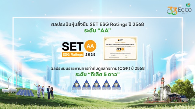 บริษัท ผลิตไฟฟ้า จำกัด (มหาชน) หรือ EGCO Group โชว์ศักยภาพ คว้าผลการประเมินความยั่งยืนในปี 2568 ทั้งระดับประเทศและระดับภูมิภาคอาเซียน ได้แก่ ผลประเมินหุ้นยั่งยืน SET ESG Ratings ปี 2568 ระดับ “AA”และผลประเมินจากโครงการสำรวจการกำกับดูแลกิจการบริษัทจดทะเบียนไทย ประจำปี 2568 (CGR 2025) ระดับ “ดีเลิศ 5 ดาว” ต่อเนื่องเป็นปีที่ 17 ในกลุ่มอุตสาหกรรมทรัพยากร ที่มีมูลค่าหลักทรัพย์ตามราคาตลาดมากกว่า 10,000 ล้านบาท ตลอดจนผลประเมิน ASEAN CG Scorecard ประจำปี 2567 (ACGS 2024) ประเภท ASEAN Asset Class PLCs ผลการประเมินทั้งหมดนี้สะท้อนแนวทางการดำเนินธุรกิจของบริษัทตามกรอบ ESG อย่างต่อเนื่อง จนได้รับการยอมรับทั้งในระดับประเทศและระดับสากล ช่วยสร้างความมั่นใจให้นักลงทุนต่อการเป็นบริษัทจดทะเบียนชั้นนำในตลาดหลักทรัพย์แห่งประเทศไทย (ตลาดหลักทรัพย์ฯ) ที่ให้ความสำคัญและบูรณาการเรื่องความยั่งยืนให้อยู่ในทุกกระบวนการการทำงานและสอดคล้องกับเป้าหมายการพัฒนาที่ยั่งยืน (SDGs) ขององค์การสหประชาชาติ และเดินหน้าสร้างการเติบโตทางธุรกิจที่สอดคล้องกับยุคเปลี่ยนผ่านของอุตสาหกรรมพลังงาน