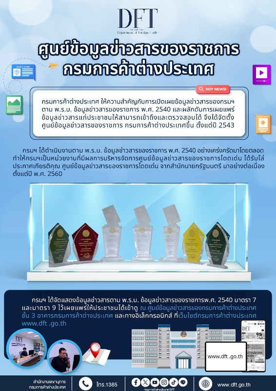 ทั้งนี้ ผู้ประกอบการหรือประชาชนสามารถสอบถามข้อมูลและค้นหาข้อมูลข่าวสารเกี่ยวกับกรมการค้าต่างประเทศได้ที่ ศูนย์ข้อมูลข่าวสารของราชการ กรมการค้าต่างประเทศ ชั้น 3 อาคารกรมการค้าต่างประเทศ จังหวัดนนทบุรี หรือทางเว็บไซต์ www.dft.go.th หรือสายด่วนกรมการค้าต่างประเทศ 1385