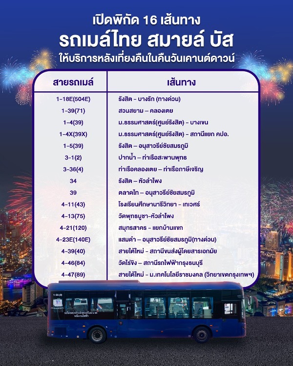 นอกจากนี้ TSB ยังขยายการให้บริการ รถเมล์ไฟฟ้า ไทย สมายล์ บัส ช่วงหลังเที่ยงคืน เพิ่มเติมอีก 16 เส้นทาง ครอบคลุมพื้นที่ท่องเที่ยวสำคัญในกรุงเทพฯ-ปริมณฑล เพื่อช่วยกระจายการเดินทาง ลดปัญหาการจราจรติดขัด และอำนวยความสะดวกให้ประชาชนสามารถเดินทางกลับบ้านได้อย่างปลอดภัยในคืนส่งท้ายปีเก่าต้อนรับปีใหม่