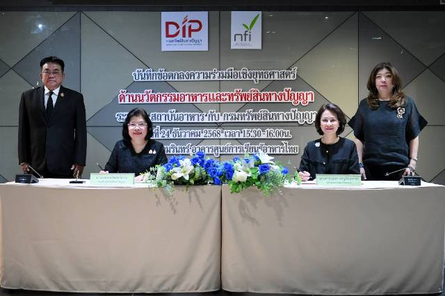 เมื่อวันที่ 24 ธันวาคม 2568 นางอรมน ทรัพย์ทวีธรรม อธิบดีกรมทรัพย์สินทางปัญญา และนางสาวไปยดา หาญชัยสุขสกุล ผู้อำนวยการสถาบันอาหาร ร่วมลงนามบันทึกข้อตกลงความร่วมมือ (MOU) เพื่อบูรณาการความร่วมมือเชิงยุทธศาสตร์ด้านนวัตกรรมอาหารและทรัพย์สินทางปัญญา มุ่งสร้างมูลค่าเพิ่มและยกระดับอุตสาหกรรมอาหารไทยให้สามารถแข่งขันในตลาดสากลได้อย่างยั่งยืน พร้อมสนับสนุนให้คนไทยเป็นเจ้าของนวัตกรรมอาหารที่ตลาดโลกต้องการ