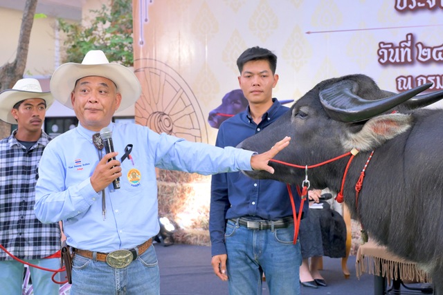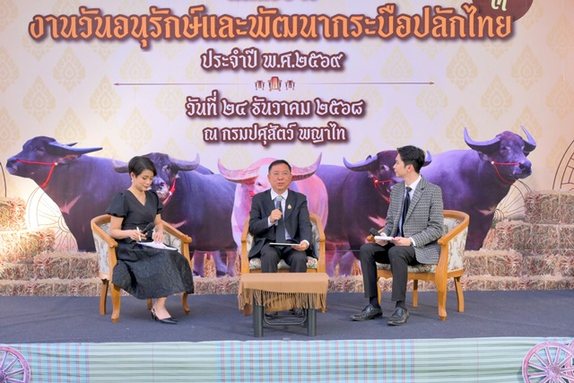 วันพุธที่ 24 ธันวาคม 2568 เวลา 16.30 น. นายสัตวแพทย์สมชวน รัตนมังคลานนท์ อธิบดีกรมปศุสัตว์ แถลงข่าวการจัดงานวันอนุรักษ์และพัฒนากระบือปลักไทย ประจำปี พ.ศ. 2569 ภายใต้หลัก “ปรัชญาของเศรษฐกิจพอเพียง และการอนุรักษ์สายพันธุ์กระบือปลักไทย” พร้อมด้วยผู้บริหารกรมปศุสัตว์ สื่อมวลชน และผู้ที่เกี่ยวข้อง เข้าร่วมฯ เพื่อประชาสัมพันธ์โครงการจัดงานวันอนุรักษ์และพัฒนากระบือปลักไทย ประจำปี พ.ศ. 2569 ที่กำหนดจัดขึ้นในระหว่างวันที่ 13 – 14 มกราคม 2569 ณ ศูนย์วิจัยและพัฒนาโคนม อำเภอปากช่อง จังหวัดนครราชสีมา โดยการแถลงข่าวในครั้งนี้ มีการจัดแสดงพันธุ์กระบือปลักไทย และผลิตภัณฑ์จากกระบือ ณ ลานเอนกประสงค์ หน้าตึกอำนวยการ กรมปศุสัตว์ พญาไท กรุงเทพมหานคร