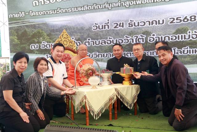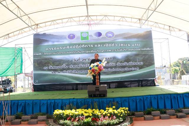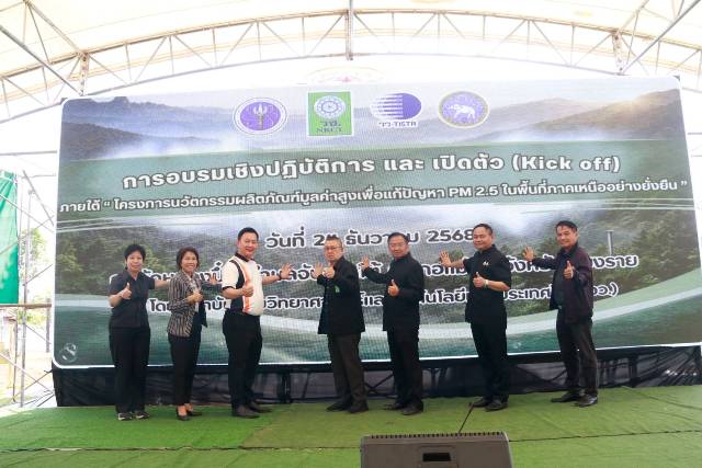 กระทรวงการอุดมศึกษา วิทยาศาสตร์ วิจัยและนวัตกรรม (อว.) โดย สถาบันวิจัยวิทยาศาสตร์และเทคโนโลยีแห่งประเทศไทย (วว.) ด้วยการสนับสนุนทุนวิจัยจาก สำนักงานการวิจัยแห่งชาติ (วช.) จัดพิธีเปิดการอบรมเชิงปฏิบัติการและงาน Kick-off “โครงการนวัตกรรมผลิตภัณฑ์มูลค่าสูงเพื่อแก้ปัญหา PM 2.5 ในพื้นที่ภาคเหนืออย่างยั่งยืน” ในวันพุธที่ 24 ธันวาคม พ.ศ. 2568 ณ วัดหนองปึ๋ง ตำบลจันจว้าใต้ อำเภอแม่จัน จังหวัดเชียงราย เพื่อนำวิทยาศาสตร์ เทคโนโลยี และนวัตกรรม (วทน.) ขับเคลื่อนการแก้ปัญหาวิกฤตหมอกควันอย่างครบวงจร ตั้งแต่ต้นน้ำจนถึงปลายน้ำ จัดตั้ง “ศูนย์ฝึกอบรมอาชีพและสาธิตการแปรรูปวัสดุชีวภาพ” ให้เป็น “แหล่งเรียนรู้คู่ชุมชน” เปลี่ยนเกษตรกรให้เป็นนวัตกร ช่วยให้พี่น้องชาวเชียงรายจัดการวัสดุเหลือทิ้งที่สามารถทำเงินได้จริง พร้อมขยายผลเป็นโมเดลดำเนินงานในพื้นที่อื่นๆ ของประเทศ