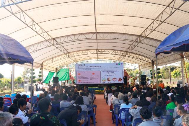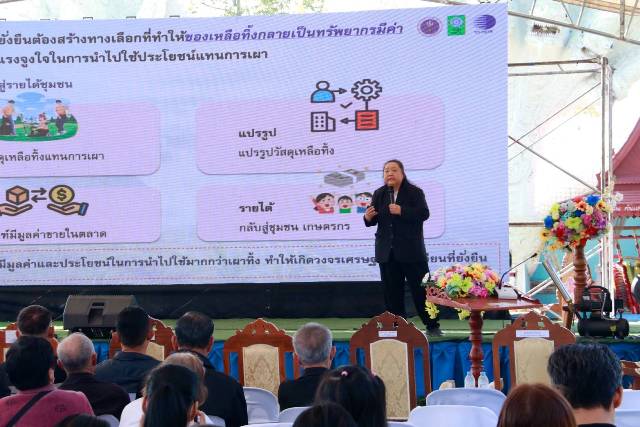 นายทนงศักดิ์ ทองแสน นายกเทศมนตรีตำบลจันจว้า ในฐานะผู้นำชุมชนของพื้นที่ดำเนินโครงการ กล่าวว่า ปัญหาฝุ่นควันและวัสดุเหลือทิ้งทางการเกษตร เป็นโจทย์ใหญ่ที่หน่วยงานร่วมกับชุมชนพยายามหาทางออกมาโดยตลอด “ศูนย์ฝึกอบรมอาชีพและสาธิตการแปรรูปวัสดุชีวภาพเพื่อการใช้ประโยชน์ระดับชุมชน” ที่จัดตั้งในพื้นที่จะเป็นแหล่งเรียนรู้คู่ชุมชนที่สำคัญของจังหวัดเชียงราย อีกทั้งยังเป็นสถานที่ซึ่งพี่น้องเกษตรกรจะมาเก็บเกี่ยววิชาความรู้ เพื่อนำไปเปลี่ยนเศษวัสดุทางการเกษตรที่ไร้ค่าให้กลายเป็นผลิตภัณฑ์ที่มีมูลค่า และช่วยสร้างรายได้กลับคืนสู่ครัวเรือน โดยไม่ต้องใช้วิธีการเผาอีกต่อไป กระผมและพี่น้องประชาชนพร้อมที่จะสนับสนุนและต่อยอดโครงการนี้อย่างเต็มกำลัง เพื่อให้ความรู้ที่ท่านนำมามอบให้ในวันนี้เกิดดอกออกผลและยั่งยืนอยู่ในชุมชนของเราสืบไป