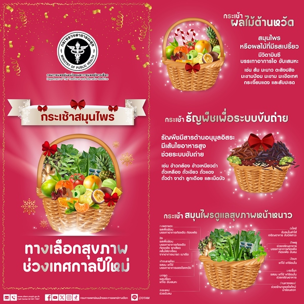“วรโชติ” แนะนำประชาชน มอบกระเช้าสมุนไพรของขวัญปีใหม่ใส่ใจสุขภาพ ชู 3 กระเช้าสมุนไพร เช่น ชุดกระเช้าผลไม้ต้านหวัด เน้นผลไม้รสเปรี้ยว ที่อุดมไปด้วยวิตามินซีป้องกันไข้หวัด ทำให้ผิวพรรณสดใส ชุดกระเช้าธัญพืช เน้นธัญพืชที่มีเส้นใยอาหารสูง ช่วยระบบขับถ่าย เช่น ข้าวกล้อง ถั่วเขียว ถั่วดำ ลูกเดือย เม็ดบัว และ ชุดกระเช้าสมุนไพรดูแลสุขภาพหน้าหนาว แนะนำสมุนไพรรสร้อน ช่วยบรรเทาอาการในช่วงฤดูหนาว เช่น กะเพราแดง ขิง ตะไคร้ฯลฯ ทางเลือกเพื่อสุขภาพดีรับปีใหม่ สุขใจผู้ให้ ถูกใจผู้รับ