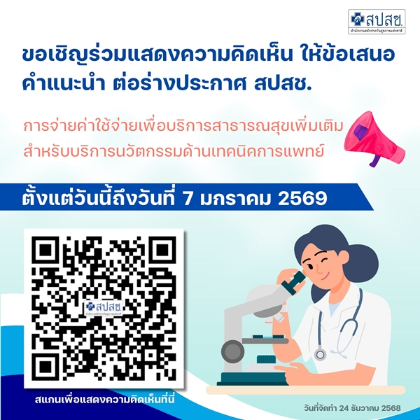 ขอเชิญร่วมแสดงความคิดเห็น ต่อร่างประกาศ สปสช. เรื่อง การจ่ายค่าใช้จ่ายเพื่อบริการสาธารณสุขเพิ่มเติม สำหรับบริการนวัตกรรมด้านเทคนิคการแพทย์  ตั้งแต่วันนี้- 7 ม.ค.69