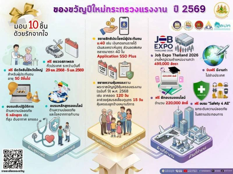 ก.แรงงาน เปิด 10 รายการของขวัญปีใหม่ 2569 ดูแลครบทั้งสุขภาพ – สวัสดิการ – การทำงาน – ความปลอดภัย เพิ่มความอุ่นใจให้คนไทยทั่วประเทศ