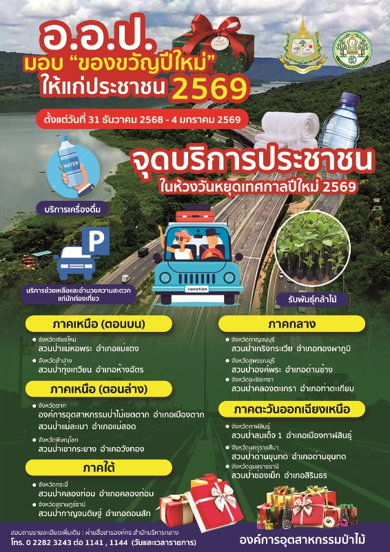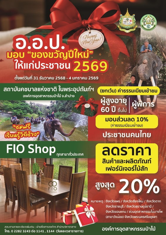 นายชนุดม เพชรสังข์ รองผู้อำนวยการ ในฐานะโฆษกองค์การอุตสาหกรรมป่าไม้ (อ.อ.ป.) เปิดเผยว่า องค์การอุตสาหกรรมป่าไม้ หน่วยงานในสังกัด ทส. ได้ขานรับนโยบาย ‘ของขวัญปีใหม่ ประจำปี พ.ศ. 2569 ให้กับประชาชน’ พร้อมจัดกิจกรรมเพื่อเป็นของขวัญในช่วงเวลาพิเศษในนามของ อ.อ.ป. ตั้งแต่วันที่ 31 ธันวาคม 2568 – วันที่ 4 มกราคม 2568 และตลอดปี 2569 รายละเอียดดังนี้