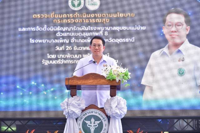 วันที่ 26 ธันวาคม 2568 นายพัฒนา พร้อมพัฒน์ รัฐมนตรีว่าการกระทรวงสาธารณสุข ตรวจเยี่ยมการดำเนินงานตามนโยบายกระทรวงสาธารณสุข และการจัดตั้งมินิธัญญารักษ์ในโรงพยาบาลชุมชนแม่ข่าย ตัวแทนเขตสุขภาพที่ 8 ที่ โรงพยาบาลเพ็ญ อ.เพ็ญ จ.อุดรธานี โดยมี นพ.เอกชัย เพียรศรีวัชรา รองปลัดกระทรวงสาธารณสุข นายณฐพล วิถี รองผู้ว่าราชการจังหวัดอุดรธานี นพ.สามารถ ถิระศักดิ์ ผู้ตรวจราชการกระทรวงสาธารณสุข เขตสุขภาพที่ 8 ดร. นพ.สมชายโชติ ปิยวัชร์เวลา นายแพทย์สาธารณสุขจังหวัดอุดรธานี นพ.ประพนธ์ เครือเจริญ ผู้อำนวยการโรงพยาบาลเพ็ญ คณะผู้บริหาร อสม. และประชาชน เข้าร่วม