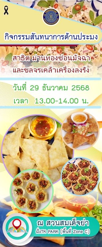 วันที่ 29 ธันวาคม 2568 เวลา 13.00–14.00 น. สาธิต เมนู “ม่านทองซ่อนมัจฉา” อาหารว่างเรียกน้ำย่อยที่มีความกรอบของแป้งปอเปี๊ยะและความนุ่มของเนื้อปลายี่สก รับประทานกับน้ำจิ้มรสชาติเข้มข้นเปรี้ยวหวานลงตัว และ “ชลจรเคล้าเครื่องลงรัง” เมนูลาบปลานิลฟูที่ปรุงด้วยรสชาติจัดจ้านวางบนถ้วยทองกรุบกรอบ รสชาติกลมกล่อม
