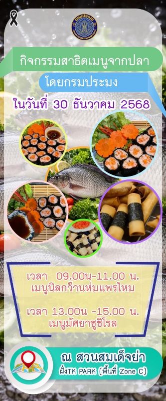 โดย กรมประมง ได้จัดกิจกรรมสาธิตการแปรรูปสัตว์น้ำ ในระหว่างวันที่ 29 – 30 ธันวาคม 2568 ณ สวนสมเด็จย่า ฝั่ง TK PARK (พื้นที่ Zone C) จึงขอเชิญชวนร่วมเยี่ยมชมกิจกรรมของกรมประมงได้ตามวันและเวลาดังกล่าว สอบถามข้อมูลเพิ่มเติมได้ที่ สำนักงานประมงจังหวัดพะเยา โทรศัพท์ 0-5443-1420 หรือ Facebook Page : สำนักงานประมงจังหวัดพะเยา
