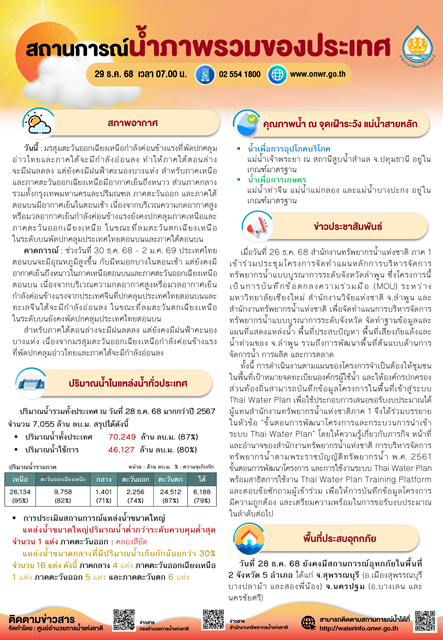 2. สถานการณ์น้ำอ่างเก็บน้ำในภาพรวม : ปริมาณน้ำรวม 87% ของความจุเก็บกัก (70,249 ล้าน ลบ.ม.) ปริมาณน้ำใช้การ 80% (46,127 ล้าน ลบ.ม.) มากกว่าปี 2567 จำนวน 7,055 ล้าน ลบ.ม.