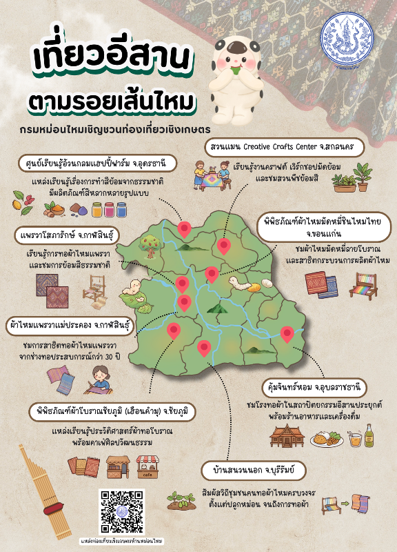 กรมหม่อนไหมจึงขอเชิญชวนท่องเที่ยวเชิงเกษตร “ตามรอยเส้นไหม” ในภูมิภาคต่าง ๆ ได้แก่