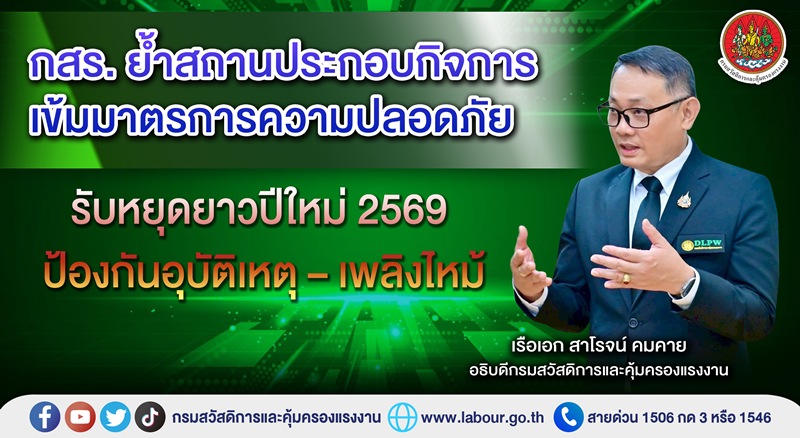 เรือเอก สาโรจน์ คมคาย อธิบดีกรมสวัสดิการและคุ้มครองแรงงาน เปิดเผยว่า ในช่วงหยุดยาวเทศกาลปีใหม่ พ.ศ. 2569 ซึ่งเป็นช่วงเวลาที่สถานประกอบกิจการจำนวนมากหยุดดำเนินงานชั่วคราว และพี่น้องผู้ใช้แรงงานจำนวนมากเดินทางกลับภูมิลำเนาหรือเดินทางท่องเที่ยวพักผ่อน กรมฯ มีความห่วงใยต่อความปลอดภัยในสถานประกอบกิจการเป็นอย่างยิ่ง จึงขอเน้นย้ำให้นายจ้าง เจ้าหน้าที่ความปลอดภัยในการทำงาน และผู้ที่เกี่ยวข้อง ให้ความสำคัญกับการเตรียมความพร้อมด้านความปลอดภัย อาชีวอนามัย และสภาพแวดล้อมในการทำงานอย่างรอบคอบ เพื่อป้องกันอุบัติเหตุและเหตุเพลิงไหม้ที่อาจเกิดขึ้นในช่วงวันหยุดยาว และลดความสูญเสียต่อชีวิตและทรัพย์สิน ตลอดจนสร้างความเชื่อมั่นว่าสถานประกอบกิจการจะสามารถกลับมาดำเนินงานได้อย่างปลอดภัยและเป็นระบบภายหลังเทศกาล