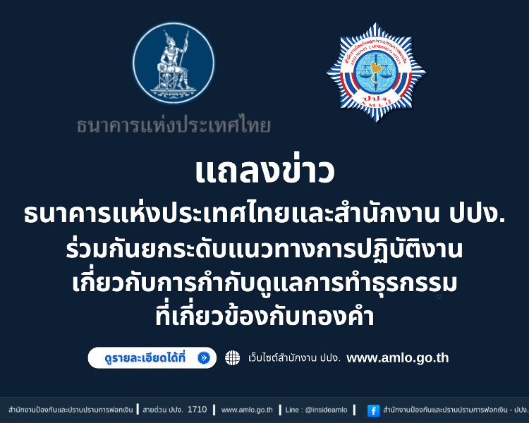 ธนาคารแห่งประเทศไทย และสำนักงาน ปปง. ร่วมกันยกระดับแนวทางการปฏิบัติงานเกี่ยวกับการกำกับดูแลการทำธุรกรรมที่เกี่ยวข้องกับทองคำ